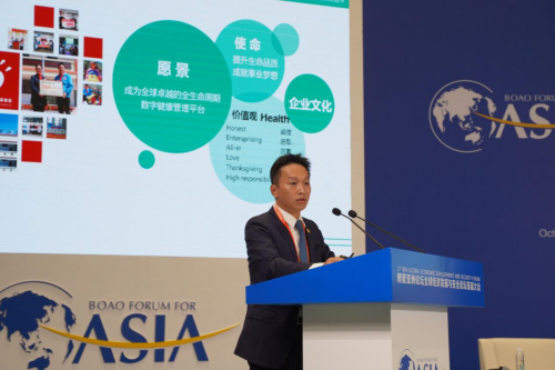中食安泓创始人及首席执行官黄祥泓为各位领导嘉宾详细介绍了中食安泓的全生命周期数字健康管理理念,并展示了本次参展的明星产品——数字健康智能检测一体机。体验者可现场测量体重、身高、血压...等身体指标并上传瘦吧APP,生成一份健康报告,获得专业体脂师的健康管理建议。
