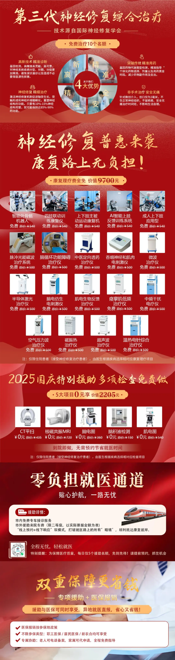 "神经修复普惠计划 2025国庆特别援助"活动的启动,是医疗惠民的又一有力举措。它让先进的神经修复技术不再遥不可及,而是真正走到患者身边,为众多饱受神经系统疾病困扰的家庭带来了新的希望,也为推动我国神经修复技术的发展和"健康中国"战略的实施添上了浓墨重彩的一笔。我们期待更多患者能从中受益,重获健康与幸福。